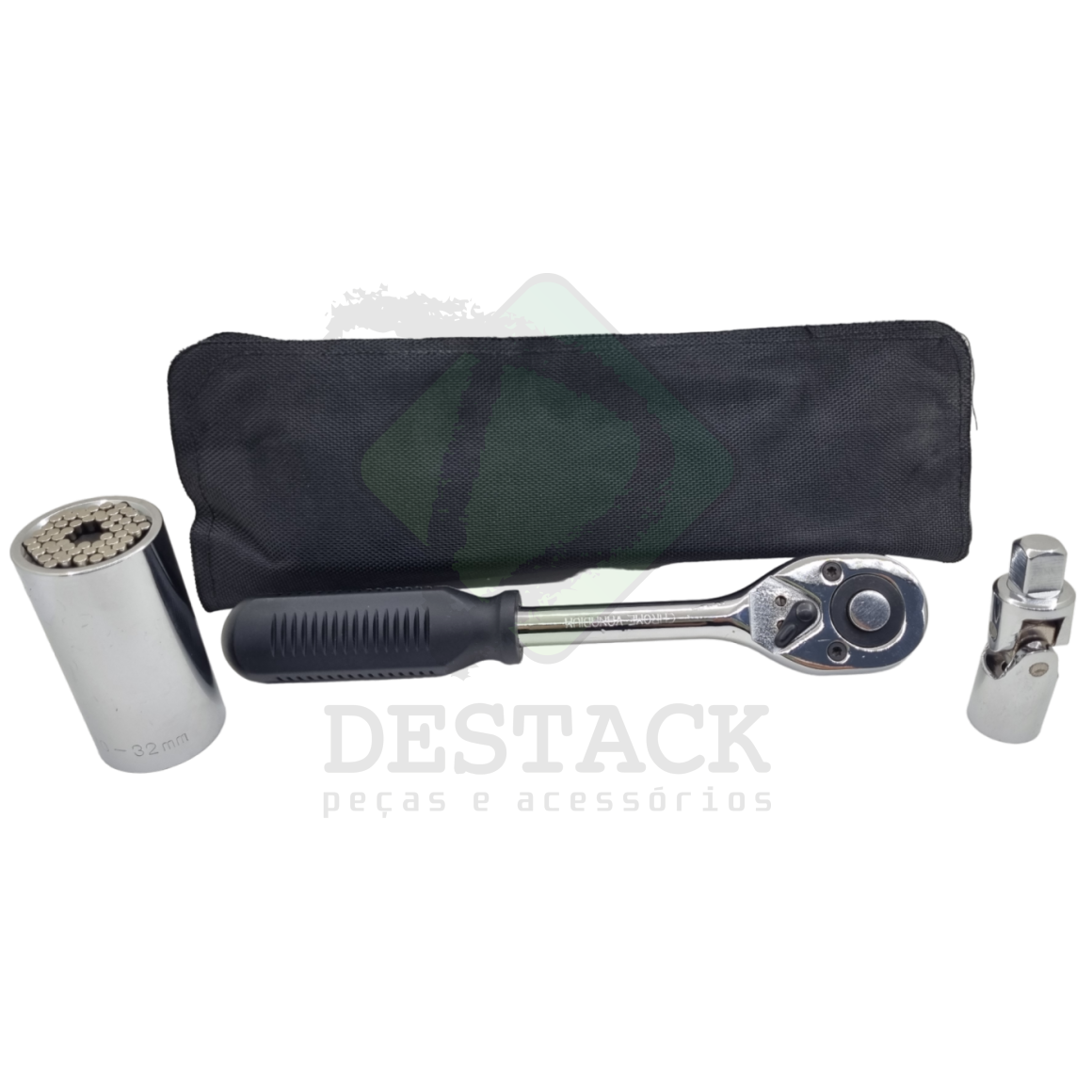 Chave Catraca Reversível + Soquete + Junta Universal Articulada + Estojo